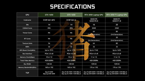 显卡属于30系列入门级显卡,笔记本用的,支持光追效果,性能属于中端。RTX3050的3Dmarktimespy跑分跟1660ti一个级别的(此处对比均为移动版显卡),性能差不多和1660TiMax-Q接近。