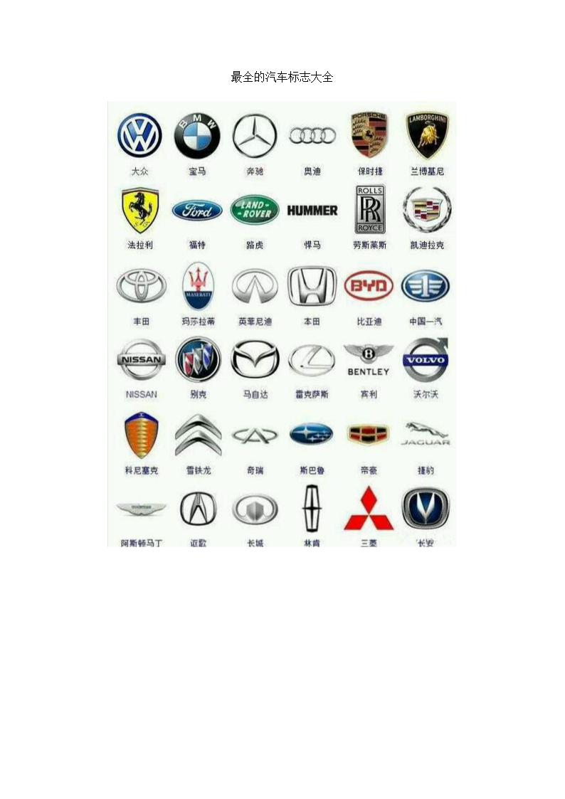 汽车标志是指各种汽车品牌的标志,这些标志往往成为汽车企业的代表。汽车的标志包括:汽车的商标或厂标,产品标牌,发动机型号及出厂编号,整车型号及出厂编号以及车辆识别代号等。狭义来说,汽车标志指的是汽车商标。如下图。