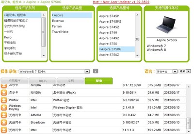 3、我的也是5750G,刚装好。主板驱动:Intel NB Chipst那个;显卡驱动:先装Intel VGA Chip,然后装nVidia VGA Chip(我的是GT630,选的是N13那个驱动),再装PHYSX。然后触摸板、声卡、网卡、快捷键驱动。