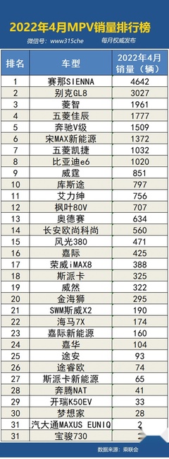5、轿车销售69万台、占比为59%,前十名分别为:五菱宏光mini、轩逸、比亚迪秦、朗逸、凯美瑞、速腾、比亚迪汉、卡罗拉、雷凌、宝马5系。