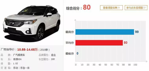 2、广汽传祺gs4质量不错传祺GS4质量不错,搭载了一台15发动机,最大输出功率124kW,最大扭矩265Nm整个动力参数,在同级别发动机中动力表现属上乘,可以提供更好的动力表现传祺GS4的主被动安全配置很齐全,包括了刹车。