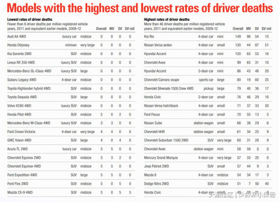5、死亡率最高的是美国通用中型SUV(多功能运动车)“雪佛莱Blazer”的双门双轮驱动款,综合得分为308分。而最低的是戴姆勒·克莱斯勒公司的大型高级轿车“梅赛德斯·奔驰E级车”,得分为10分。