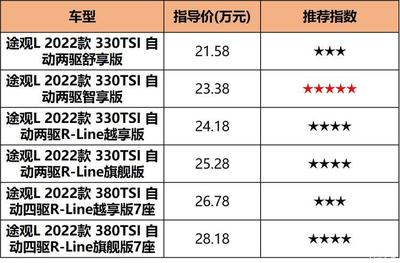 途观L2022款是一款大众旗下的中型SUV,其官方指导价为元元我们以途观L2022款330TSI自动两驱RLine越享版为例,该车型的官方指导价为元,据了解,目前汉中市没有什么优惠如果按照全款购买来计算。