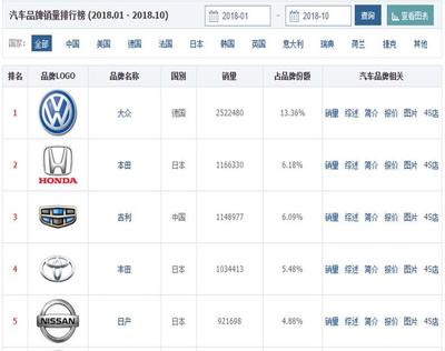 国内汽车销量排行榜前十名品牌除一汽大众上汽大众外,上汽通用吉利汽车东风日产长安汽车销量突破100万辆其中,上汽通用吉利汽车东风日产分别销售1辆1辆9辆,同比减少92%28%64%。