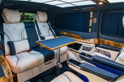 4、这台奔驰V260L巴赫圣母峰的灵魂采用的是奔驰V级,但是内部的变化可谓是翻天覆地,驾驶舱仪表台被一整块的枫木饰板所替换,仪表台上方及主副驾驶座椅均进行了重新的真皮包裹。