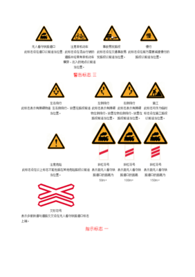 道路交通安全标志是使用文字或符号传达指引、限制、警告或指示的道路设施。又称路标和道路交通标志。警告标志 警告车辆、行人注意危险地点的标志。警告标志的颜色为黄底、黑边、黑图案。形状为等边三角形,顶角朝上。